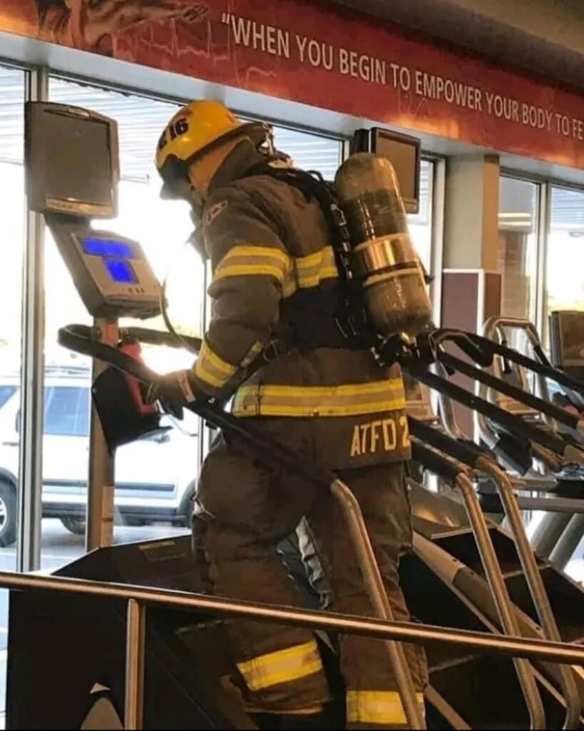 At first glance, it looked like just another evening at the gym. The machines hummed, people jogged on treadmills, headphones in, lost in their own rhythm. But then, in the corner, a sight caught everyone’s eye: a firefighter, dressed head to toe in full turnout gear. Helmet strapped, mask on, oxygen tank secured to his back.