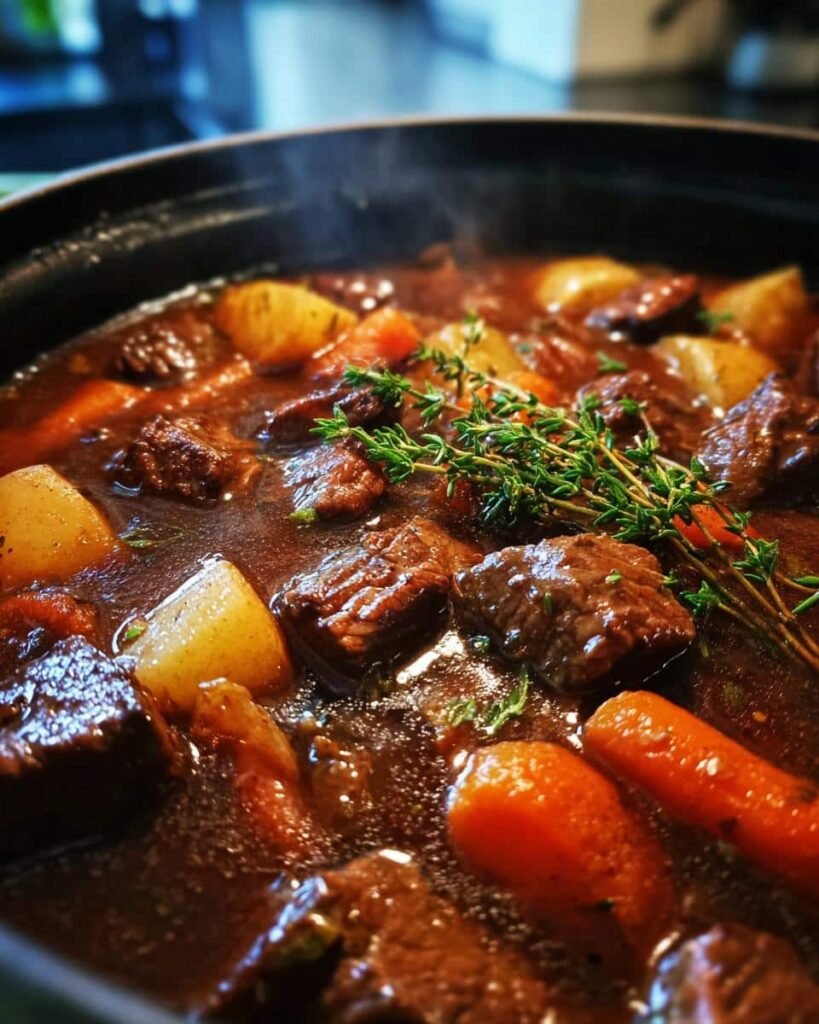 4. Pour in beef broth and add potatoes, salt, pepper, and thyme.