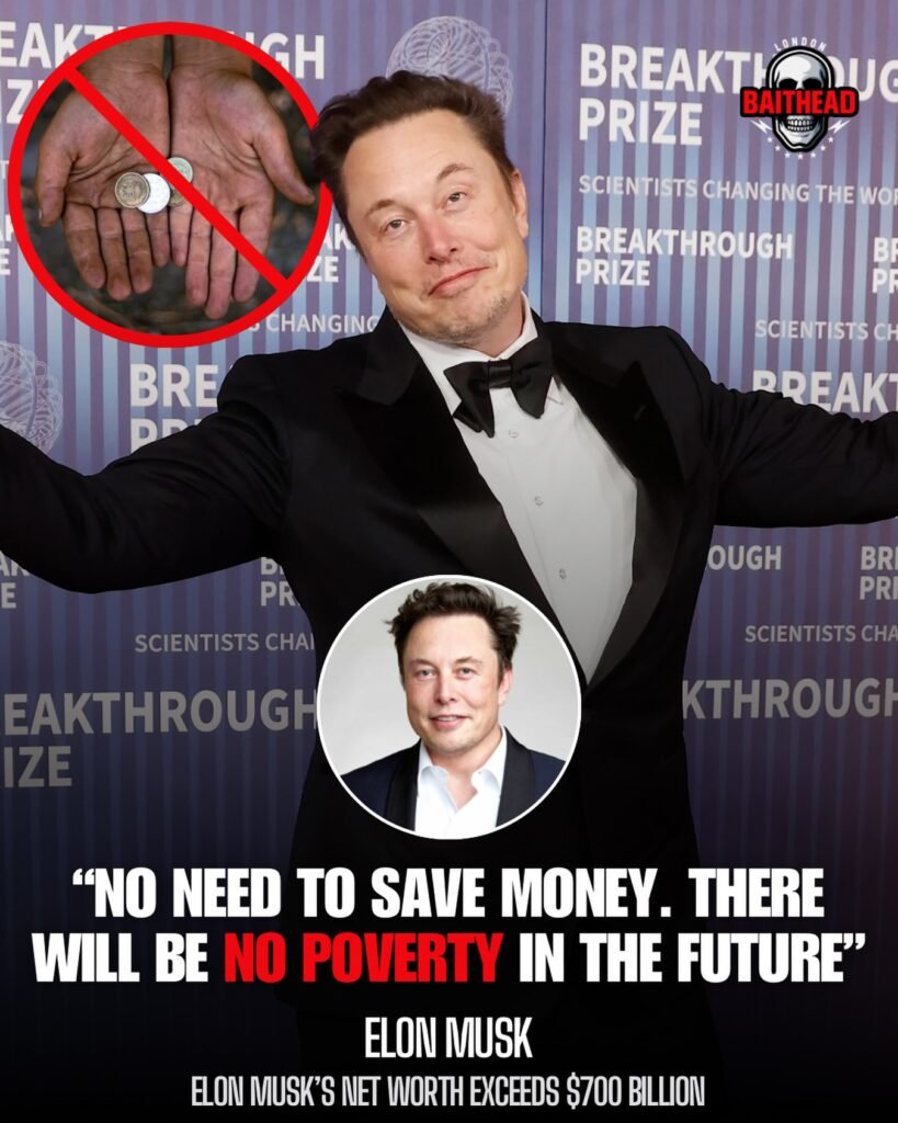 The image presents a striking contrast: Elon Musk, dressed in a formal tuxedo at a high-profile event, arms open in a gesture that suggests confidence and ambition, paired with a powerful quote declaring, “No need to save money. There will be no poverty in the future.” Alongside it, symbols of poverty—coins in worn hands crossed out in red—reinforce the message of a world transformed by progress and innovation.