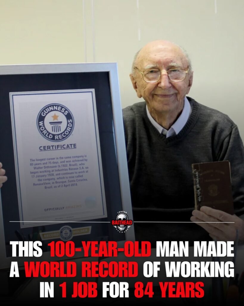 The image tells an extraordinary story of perseverance and loyalty. An elderly man, calm and dignified, holds a Guinness World Records certificate—official recognition of a feat rarely seen in modern history. At 100 years old, he achieved a world record by working in the same job for an astonishing 84 years, a milestone that transcends statistics and speaks directly to the values of dedication, purpose, and endurance.