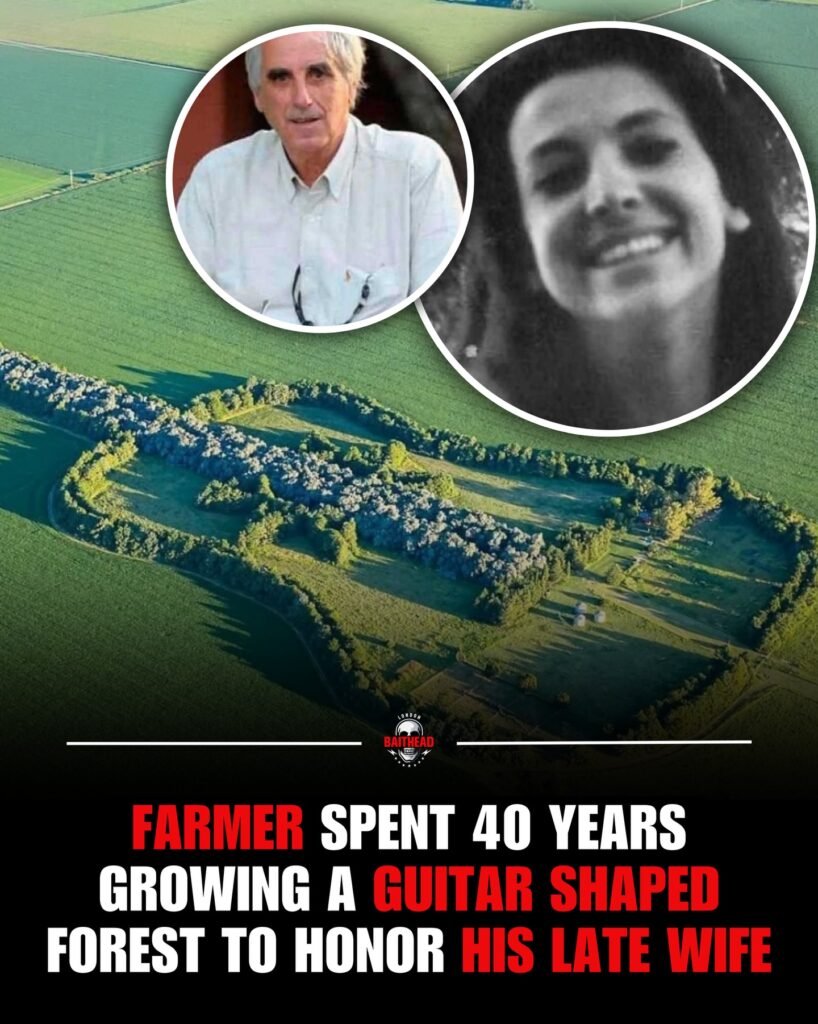 From above, the landscape looks like a secret revealed only to the sky. Fields stretch outward in quiet greens, but at their heart lies something extraordinary: a forest carefully shaped into the unmistakable outline of a guitar. It is not a monument of stone or steel. It is living, breathing, and growing—tree by tree—over decades.
