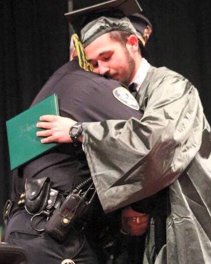 Days later, that promise came to life. As the graduation ceremony unfolded, students walked the stage to collect their diplomas. And when Kazzie’s name was called, the audience rose to their feet. There, waiting at the edge of the stage, was Officer Ellison.