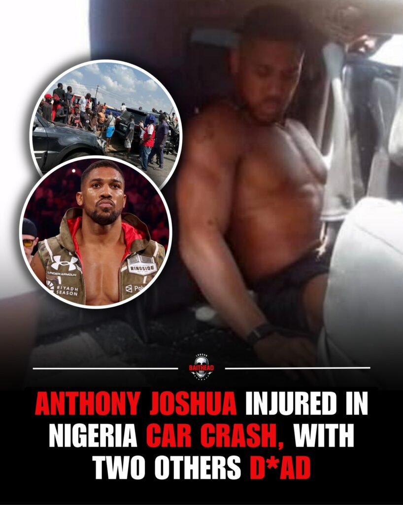 The image presents a dramatic and alarming claim: that heavyweight boxing star Anthony Joshua was injured in a car crash in Nigeria, with two others reported dead. Paired with intense visuals—a shirtless man inside a damaged vehicle, crowd scenes, and an image of Joshua in boxing gear—the post is designed to shock, spread fast, and provoke immediate emotional reactions.