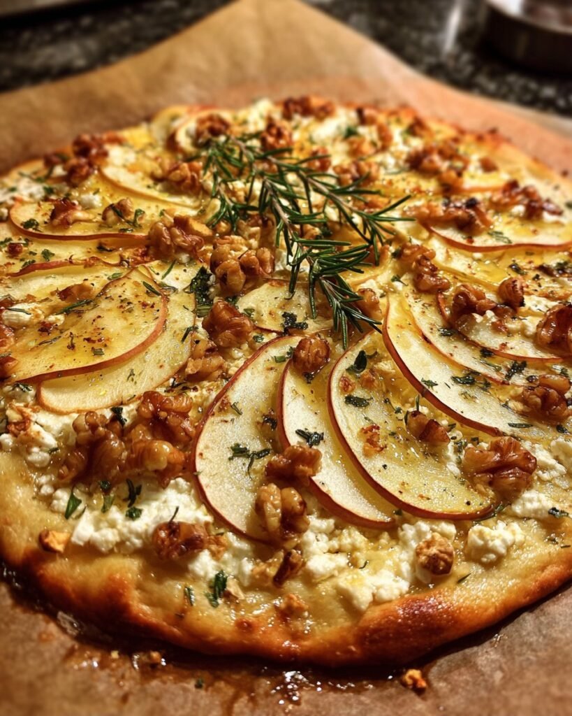 Drizzle olive oil over flatbread, then evenly layer apple slices, crumbled feta, and chopped walnuts.