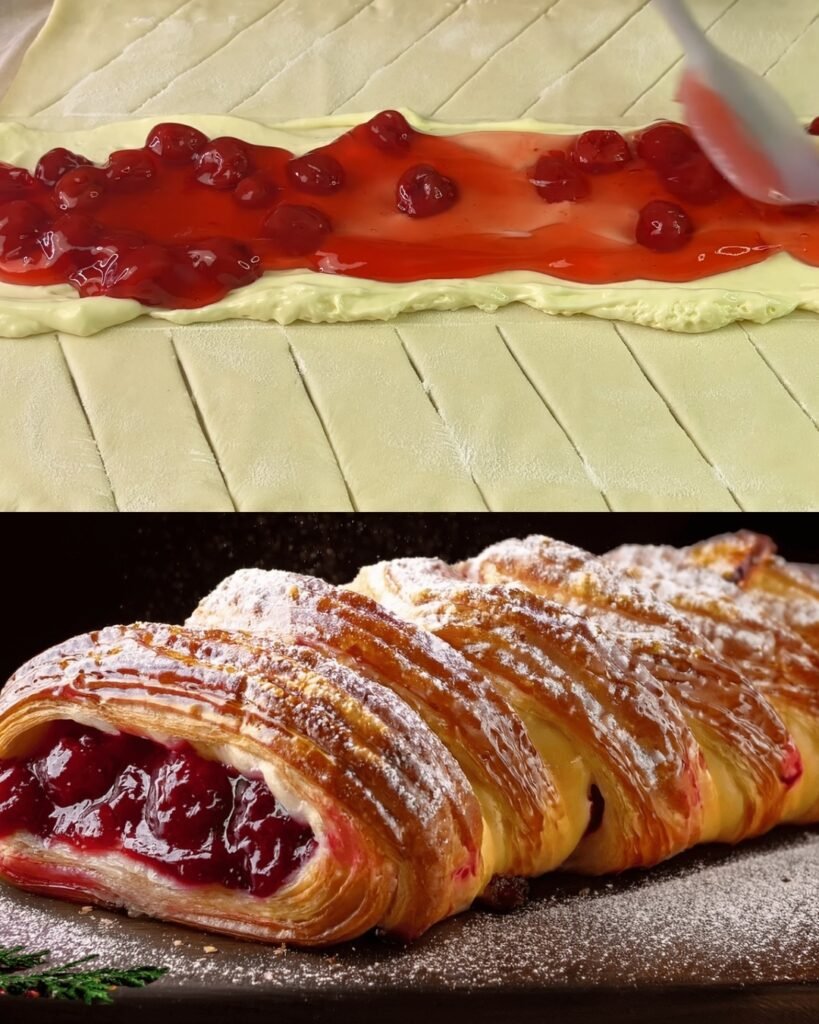 Flaky, buttery puff pastry meets luscious cheesecake filling and sweet cherry jam in this elegant braided dessert. Finished with a golden sugar crust and a snowy dusting of powdered sugar, this treat is as beautiful as it is delicious. Whether served with warm green tea or fresh berries, it’s a showstopper that looks bakery-made but is simple enough to prepare at home.