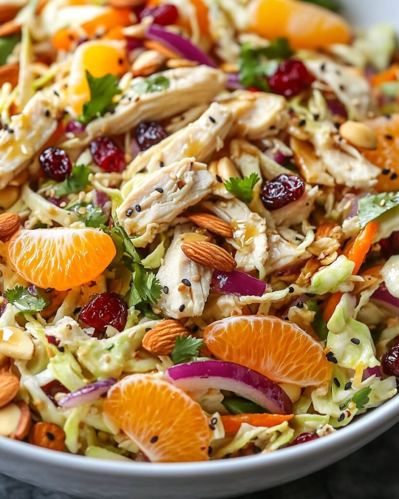 This salad offers a perfect balance of sweet, savory, and tangy flavors. The combination of crunchy almonds or cashews, dried cranberries, and refreshing mandarin oranges provides the ideal contrast to the shredded chicken and coleslaw mix. Meanwhile, the ginger sesame dressing adds a bright and bold punch, making each bite satisfying and delicious.