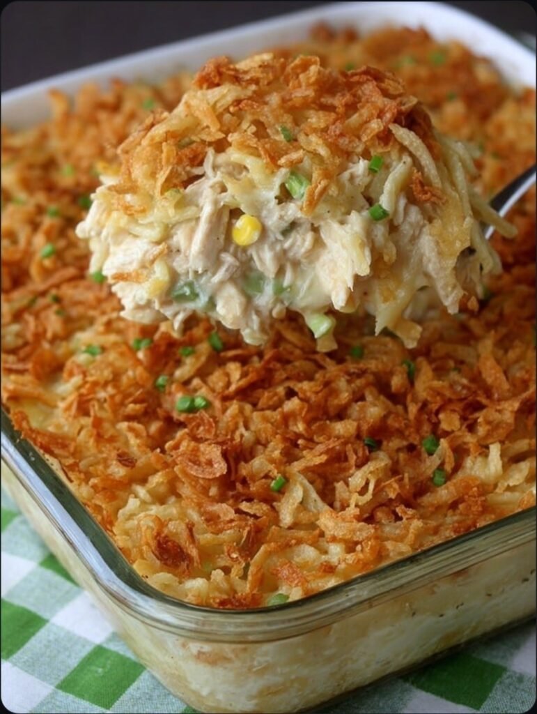- 1 ½ cups French fried onions or crushed potato chips for topping