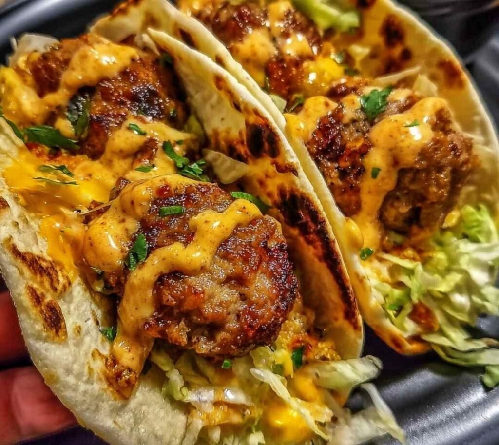 Crispy Smashed Cowboy Butter Burger Tacos Stuffed with Melty Cheese, Caramelized Edges & Served with a Bold Spicy Garlic Dipping Sauce