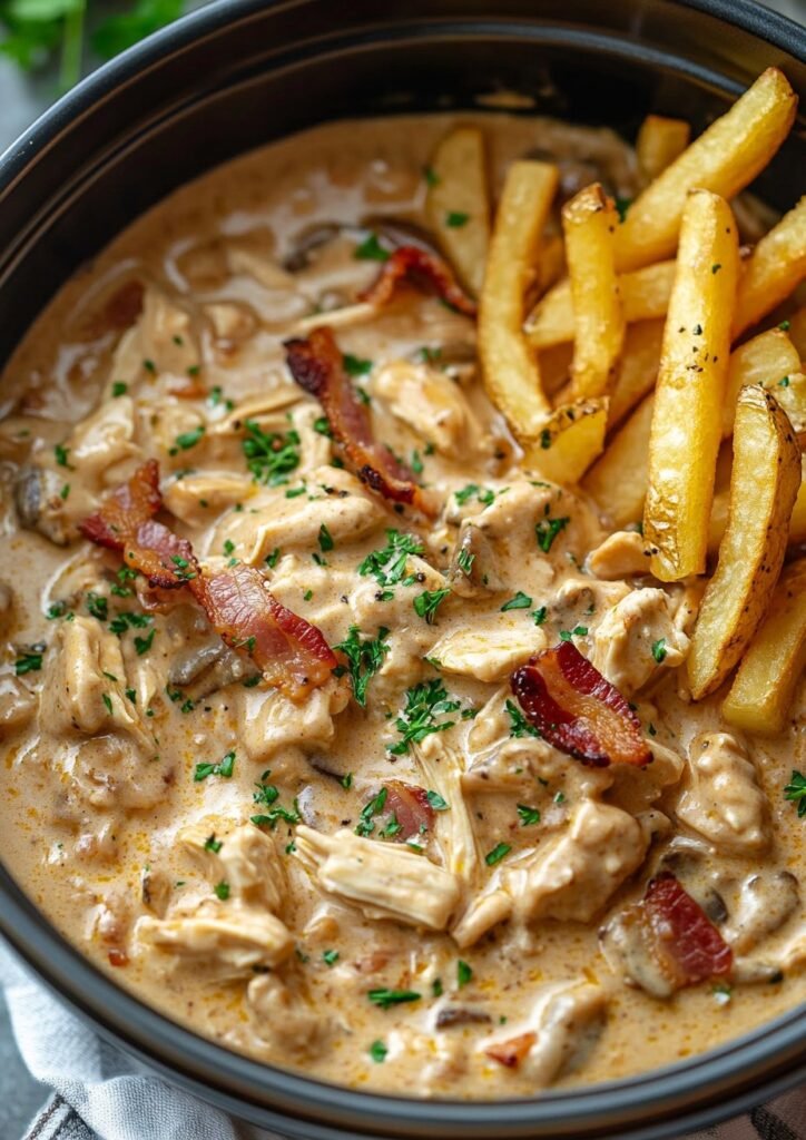 Creamy Chicken Bacon Stroganoff Slow-Cooked to Perfection, Served with Golden Fries