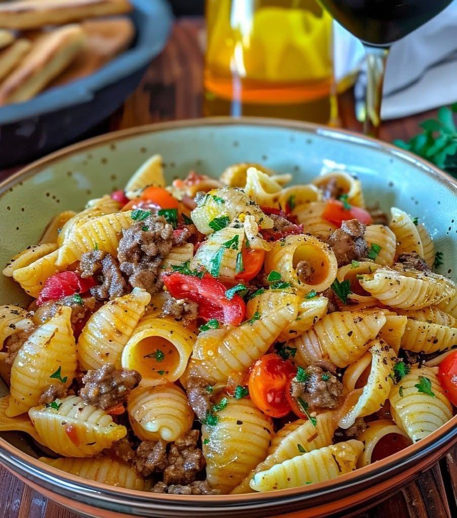 - Combine Pasta and Sauce:Â Add cooked pasta shells to the skillet with the ground beef sauce. Toss to coat evenly. If sauce is too thick, add some reserved pasta water.