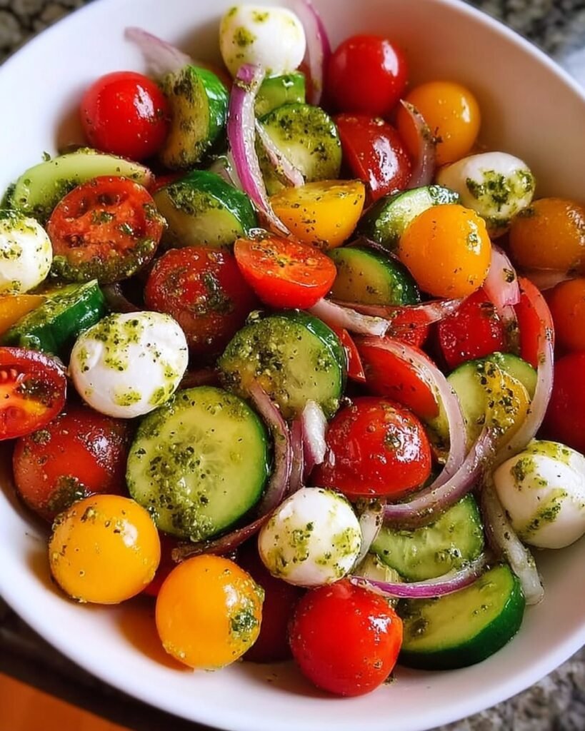 - Combine Fresh Ingredients:Â In a spacious bowl, gently toss the tomatoes, avocado, cucumber, diced onion, and mozzarella balls.