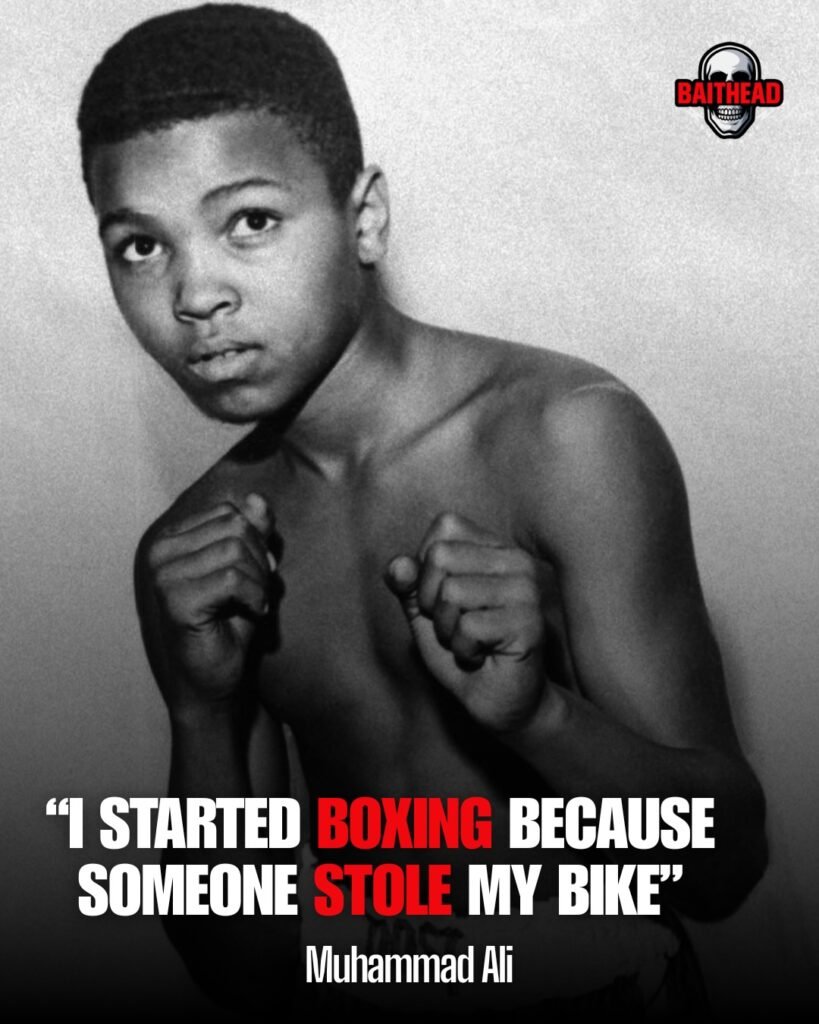 The image is simple, powerful, and timeless. A young Muhammad Ali stands bare-chested, fists raised, eyes alert with a mix of innocence and resolve. Beneath him, a quote that sounds almost casual in its honesty: “I started boxing because someone stole my bike.” What appears at first like a humorous origin story unfolds into a profound lesson about how life often redirects pain into purpose.