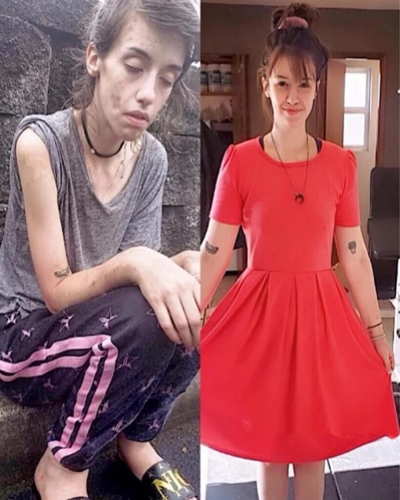 The image on the left was taken at one of those moments. A frail young woman crouches against a cold stone wall, her eyes half-closed, her body a shadow of what it once was. Her arms are thin, her skin pale, her spirit nearly extinguished. At just 93 pounds, she was surviving day to day on the streets, numb to everything except the next fix.