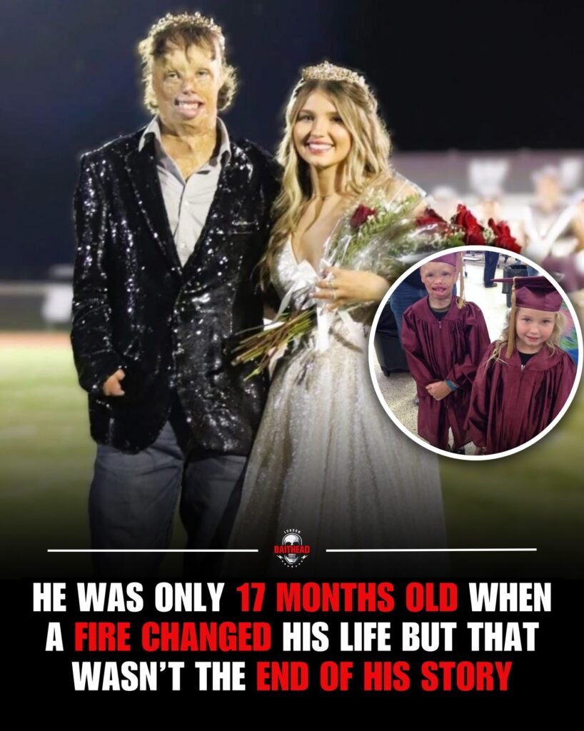 The headline tells us that he was only 17 months old when a fire changed his life forever. At an age when most children are just learning to walk and speak, he faced a tragedy that left permanent marks on his body. Severe burns reshaped his appearance and, no doubt, the course of his life. Pain, surgeries, and long recoveries became part of his childhood before he could even understand why.