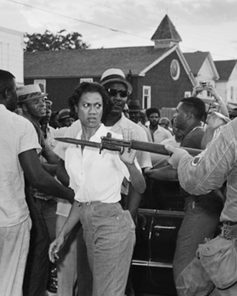 She stands in the photograph forever frozen in defiance — a Black woman in a simple buttoned shirt and jeans, one hand calmly pushing away the bayonet of a National Guardsman. No fear in her eyes. No hesitation in her movement. Only the unspoken declaration: I don’t have time for this.