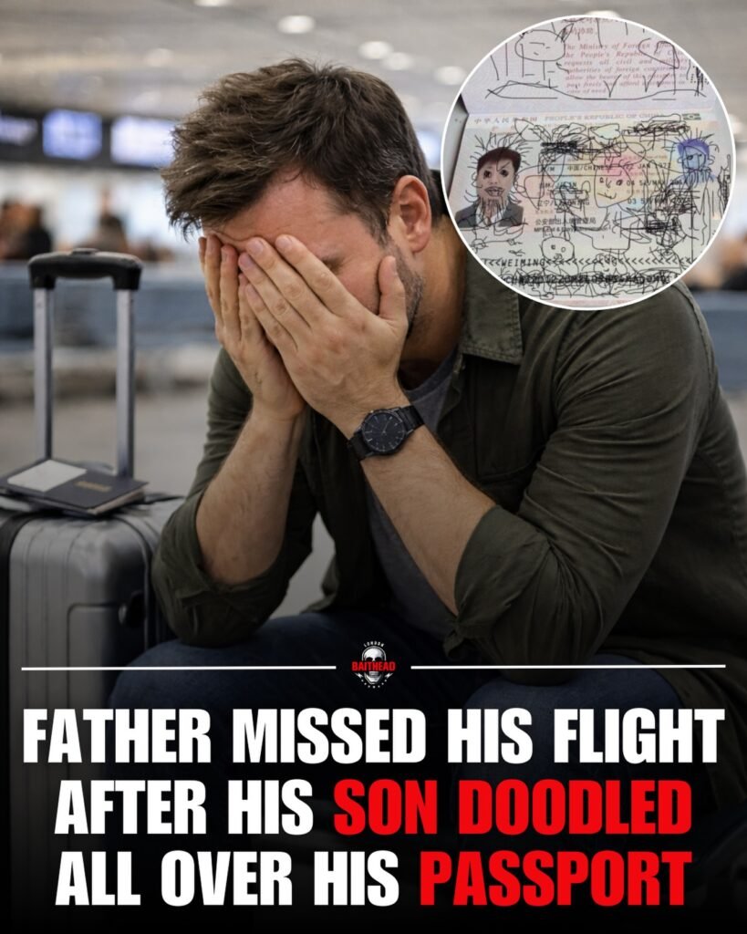 According to the story behind the image, the man missed his flight after his young son had doodled all over his passport. While the drawings may have been innocent and playful, they rendered the document invalid in the eyes of airport authorities. With critical identification details obscured or altered, the passport could no longer be accepted for international travel.