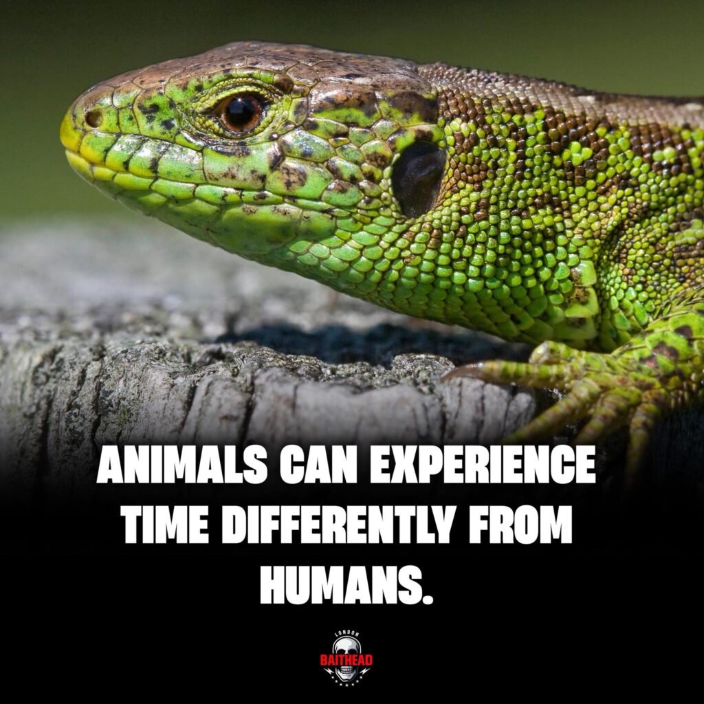 The image of a vivid green lizard resting quietly on a branch is paired with a fascinating statement: animals can experience time differently from humans. While the scene appears calm and still to us, science suggests that the way animals perceive the passage of time can be remarkably different from our own—and this difference shapes how they survive, hunt, and interact with the world.