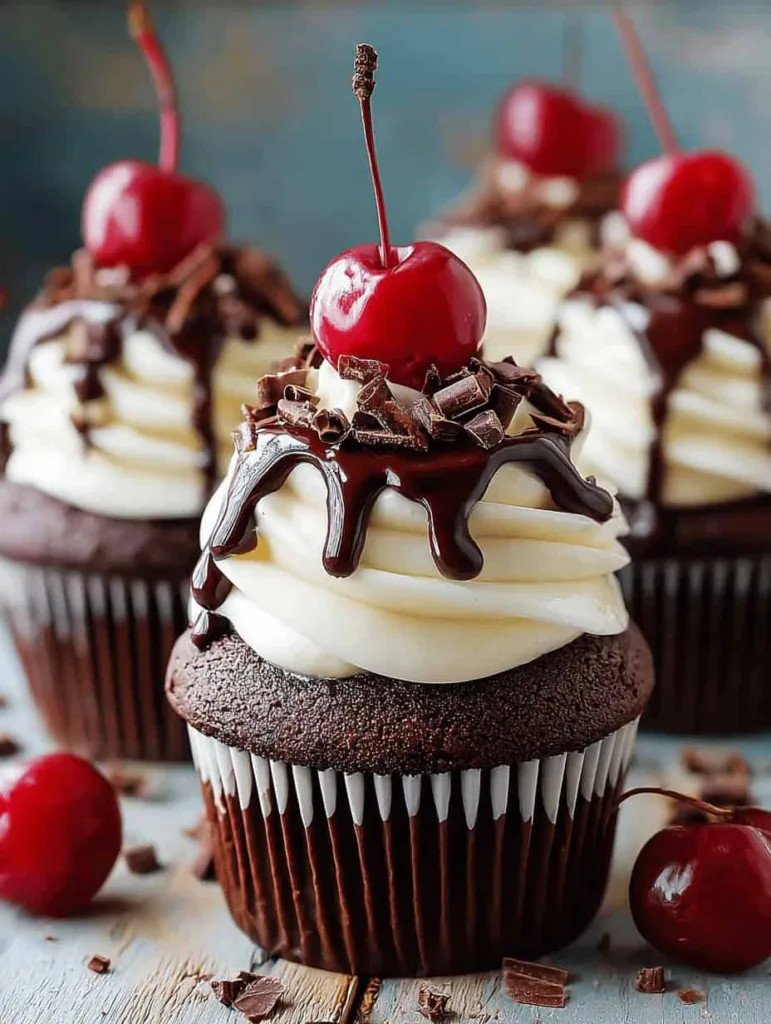 Drizzle each cupcake with chocolate ganache or chocolate syrup – let it cascade down the sides naturally for the most appealing look. Top each cupcake with a fresh cherry (with stem if available) or a maraschino cherry, and finish with chocolate shavings if desired. The contrast of colors and textures makes these cupcakes absolutely stunning.