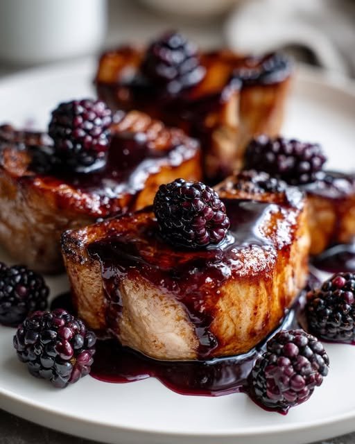 Juicy pork chops glazed with a sweet and tangy blackberry balsamic sauce.