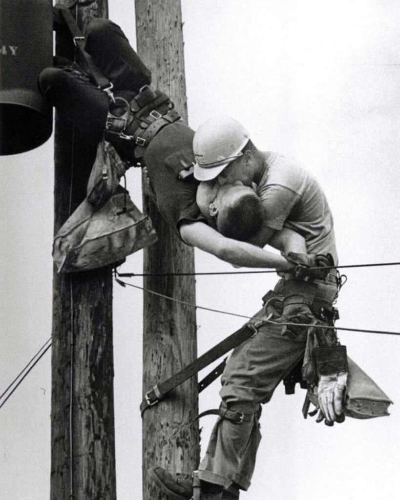 In the photograph, Jay Thompson’s face is tense with effort, his mouth sealed over Randall’s as he breathes life into him. The composition is pure instinct — two men hanging against the sky, surrounded by danger, yet locked in one of the most intimate acts of humanity imaginable.