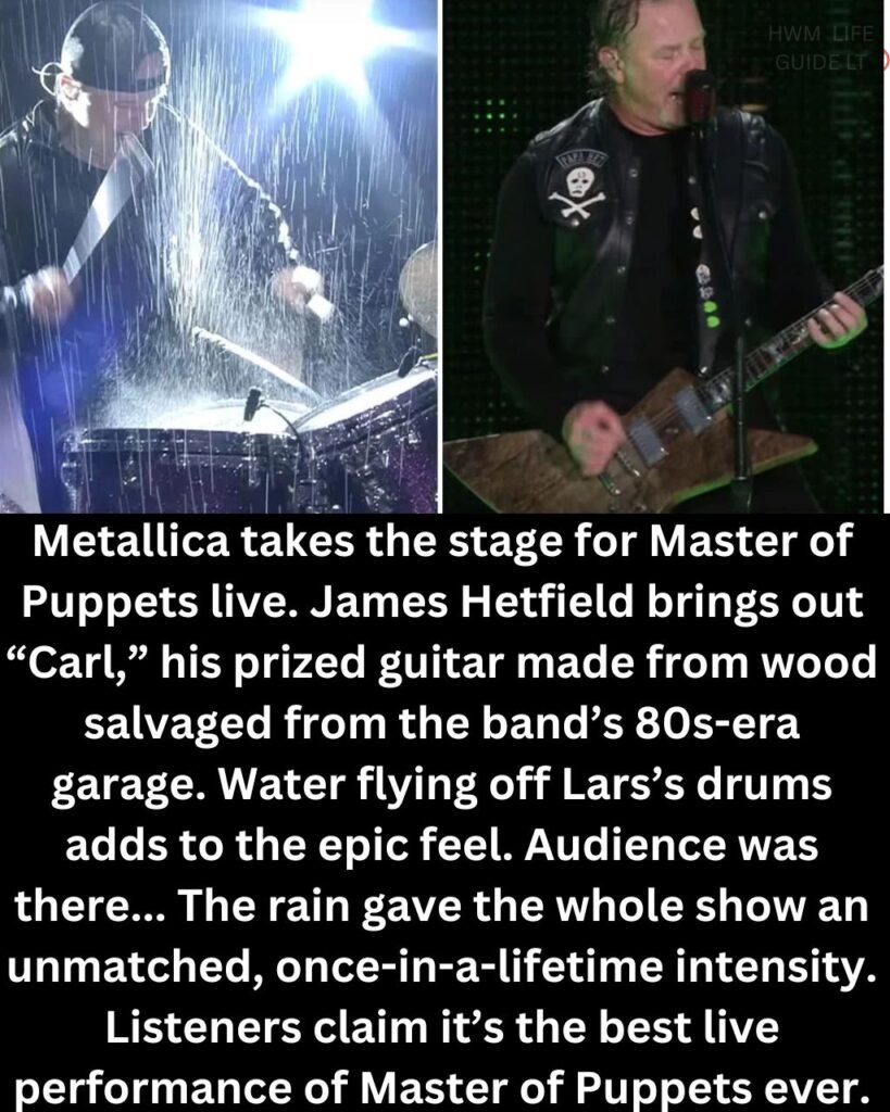 In more recent shows, like Munich’s 2024 downpour during the M72 tour, photos and video are outpacing even Manchester’s spectacle. Again, water cascades off the drums, cymbals shine under floodlights, and the crowd is drenched — soaked through but electrified. Fans and critics alike often say, “That was the best live Master of Puppets I’ve ever heard.”