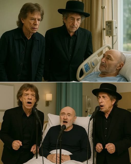 On August 25, 2025, Mick Jagger and Bob Dylan made a surprise visit to the hospital room of Phil Collins in London, offering a profoundly touching moment that transcended celebrity. Their presence in the quiet, sterile halls turned the visit into more than just a meeting—it became a rare, deeply human connection among music icons. Patients, staff, and fans online were captivated by photos and updates revealing the trio’s extraordinary camaraderie.