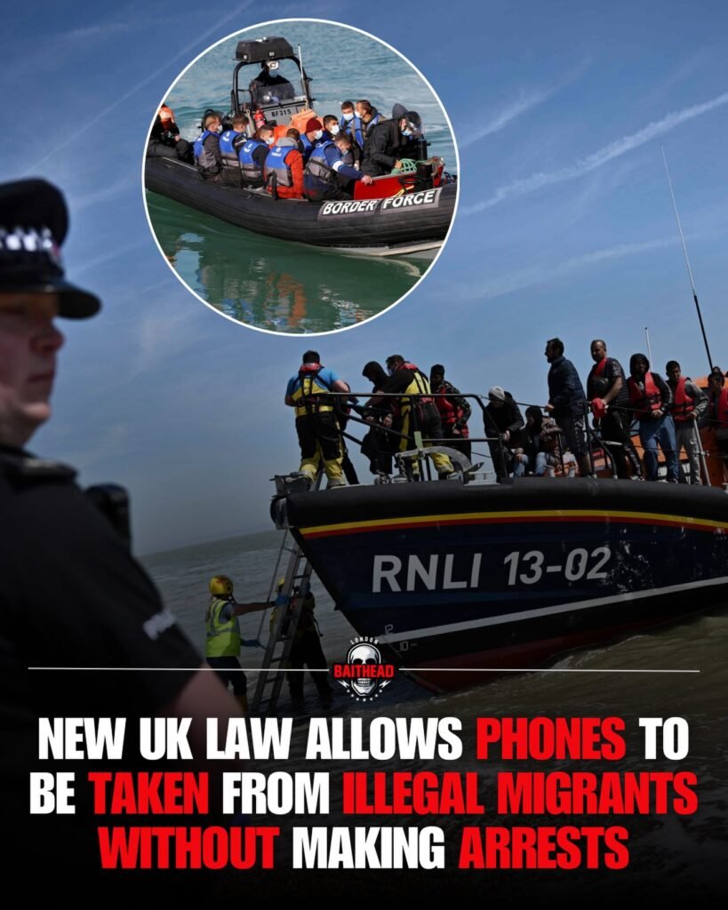 The image captures a tense moment at sea: rescue and enforcement vessels meet crowded boats, uniforms and life jackets pressed together against grey water and open sky. In bold text layered over the scene, a claim stands out—“New UK law allows phones to be taken from illegal migrants without making arrests.” Whether viewed as enforcement, deterrence, or controversy, the image reflects a larger and deeply polarizing conversation about borders, technology, and human rights.