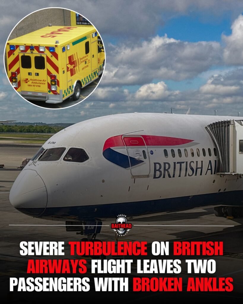 A British Airways flight was shaken by a sudden episode of severe turbulence, leaving two passengers with broken ankles and highlighting the unpredictable risks of air travel. The incident, depicted in the image, shows a British Airways aircraft on the runway, accompanied by an inset photo of an emergency ambulance responding to the situation after landing.