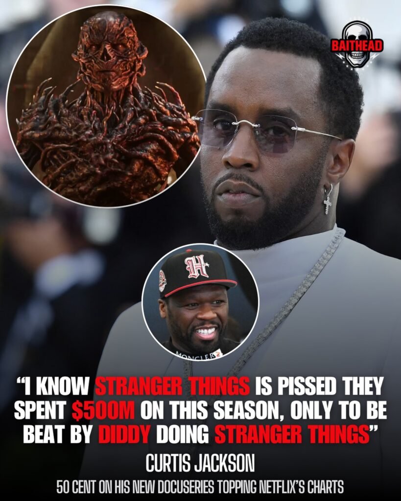 The image circulating online is designed to stop viewers mid-scroll. It blends pop culture horror with real-world celebrity rivalry, visually mashing up a grotesque monster from Stranger Things alongside two high-profile figures from the hip-hop and entertainment world. At the center of the image is a bold quote attributed to Curtis Jackson, suggesting that despite Netflix reportedly spending hundreds of millions on a new season of Stranger Things, the platform’s charts were overtaken by a documentary centered on Sean “Diddy” Combs. The message is clear: reality, controversy, and celebrity drama can outperform even the most expensive scripted television.