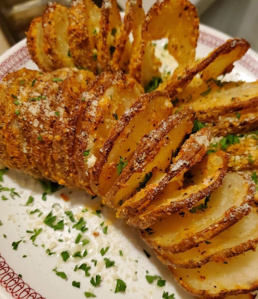 - Cut the potatoes no more than halfway down, making thin slices across. Angle the slices for extra crispiness.