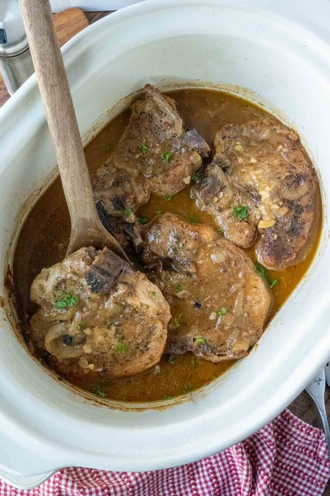 - Add sliced mushrooms, carrots, or baby potatoes on the bottom of the slow cooker before adding the pork chops. They’ll soak up all that delicious gravy.