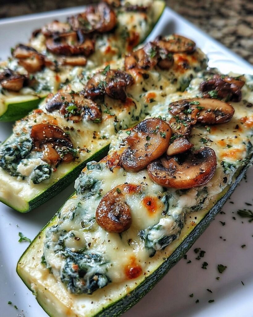 - Sauté spinach and mushrooms until cooked, then mix in the scooped zucchini flesh.