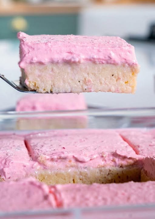 - Assemble and Serve: Once the cake has fully absorbed the strawberry milk, spoon the strawberry whipped topping onto the cake and spread it into an even layer. Decorate with fresh strawberries as desired. Serve chilled.