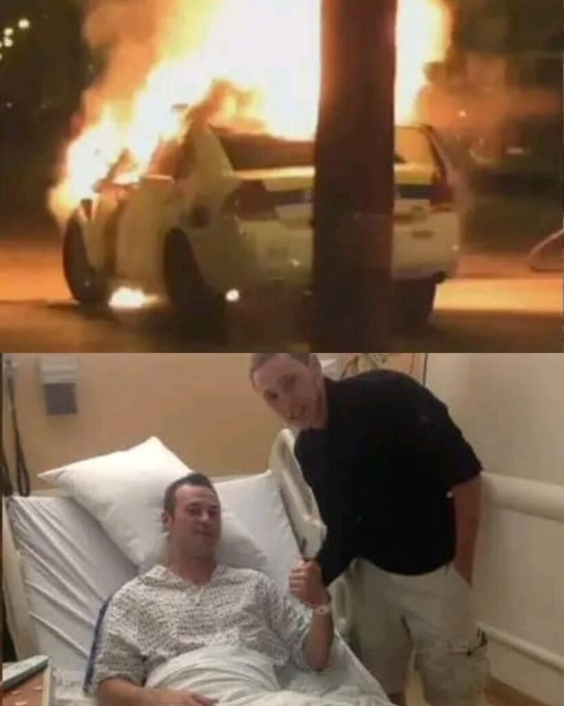 But giving up was never an option. Joe shouted for help, calling over his neighbor. Together, the two worked desperately against the smoke and the heat. Realizing the door wouldn’t budge, they shifted their focus to the window. With every ounce of strength, they pulled Officer Kimsey out through the shattered glass, dragging him to safety just seconds before the squad car was engulfed in flames.