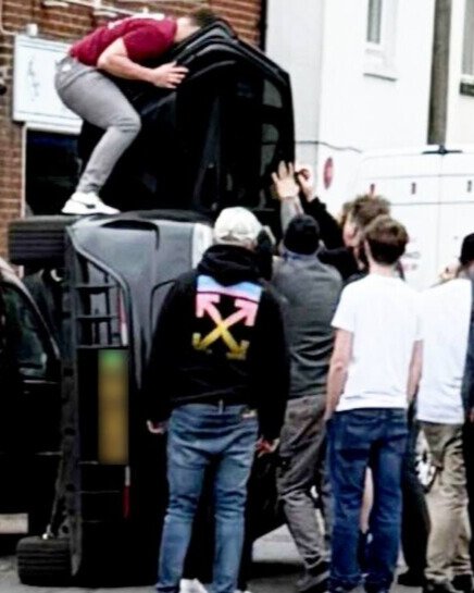 When he drew closer, the sight took his breath away. The car lay on its side, the wheels still spinning, and several of the teenagers had already climbed onto the roof, desperately trying to reach those trapped inside. Others crouched at the broken windows, calling to the family, offering reassurance.
