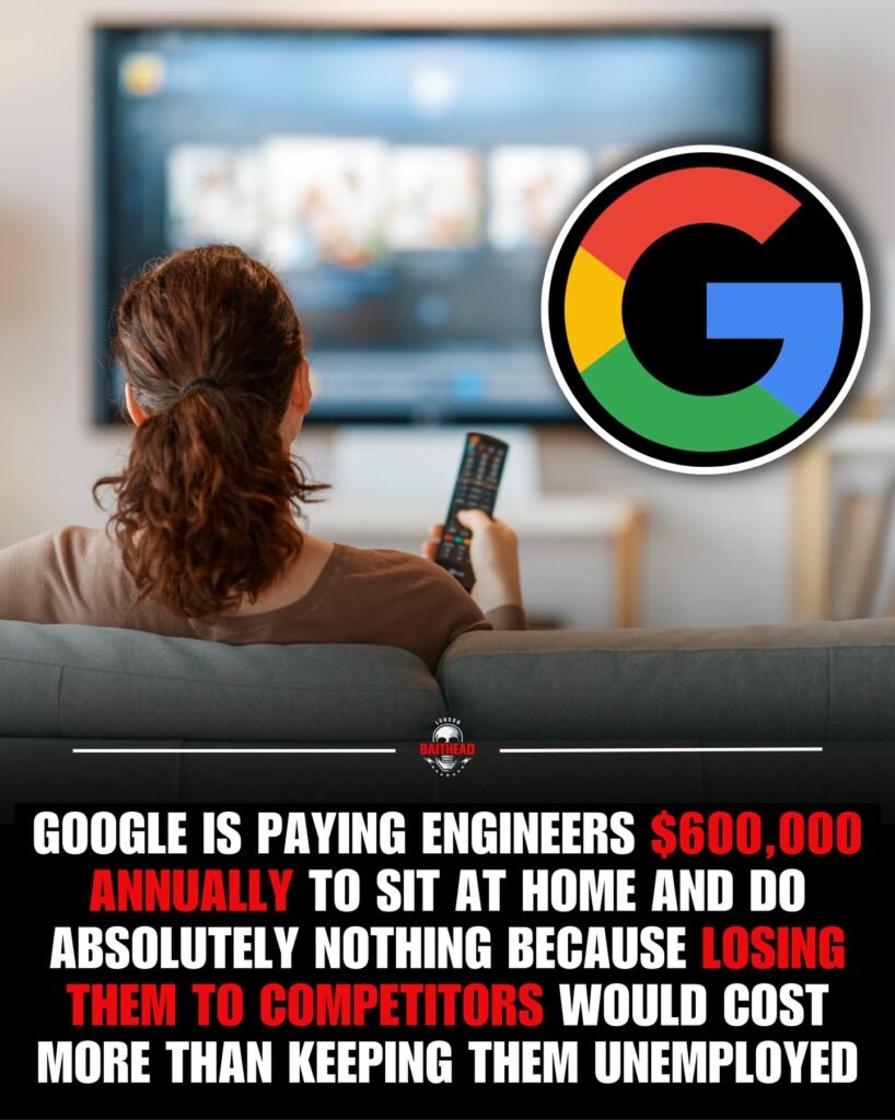 The image delivers a striking and provocative message: Google is allegedly paying engineers up to $600,000 a year to stay at home and do nothing, simply to prevent competitors from hiring them. Visually, it pairs an everyday scene—someone relaxed on a couch watching TV—with the unmistakable Google logo and bold, alarming text. Together, they form a narrative about power, money, and control in today’s technology-driven world.