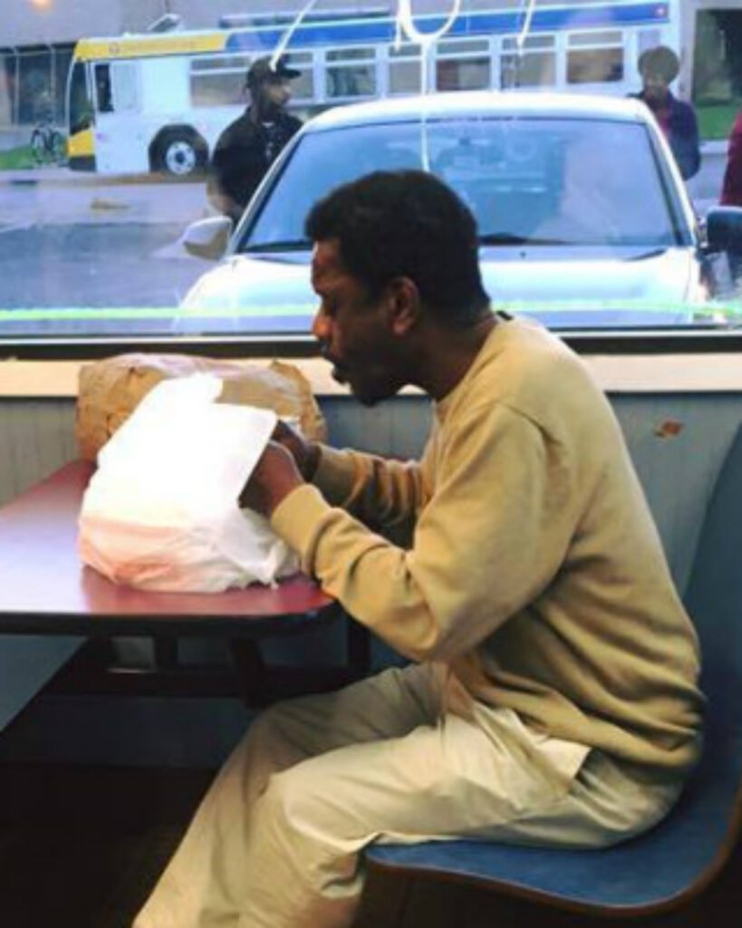 The restaurant was almost empty — just the hum of the fryer and the faint sound of traffic outside. He sat alone in the corner booth, his hands folded around a small white paper bag, as if it contained something far more precious than food.
