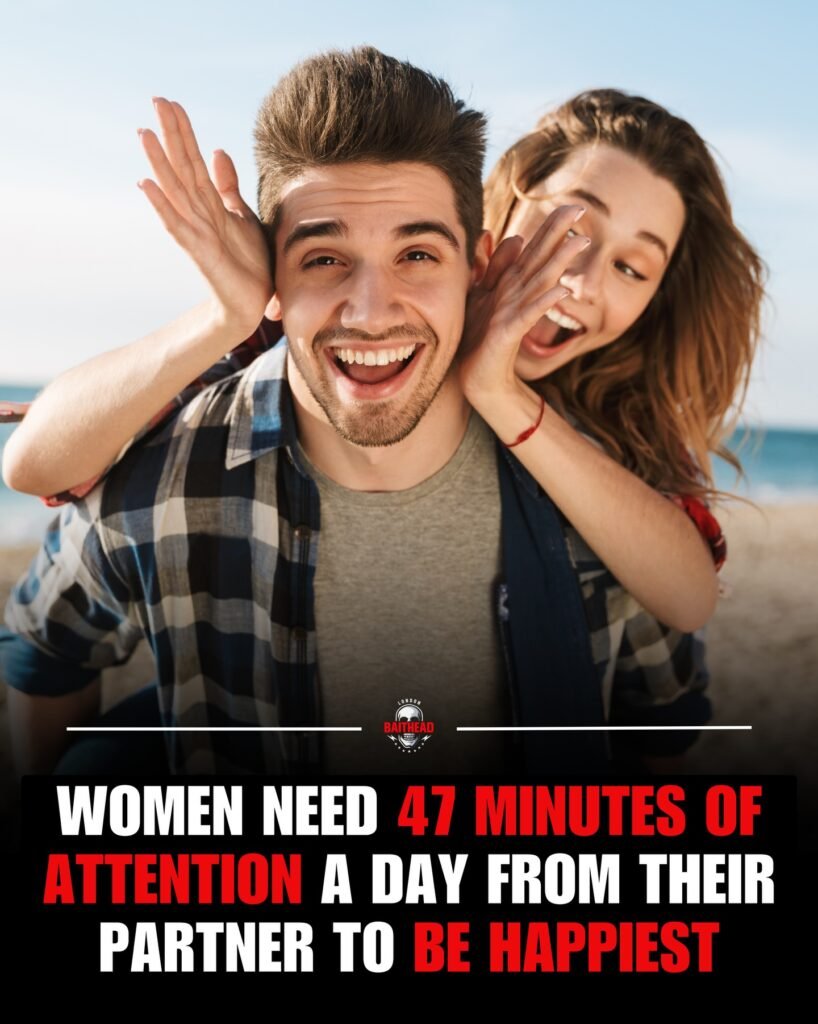At first glance, the image radiates joy. A couple stands by the seaside, laughter frozen in a playful moment. The man smiles directly at the camera while the woman, leaning in from behind, cups his ears with a mischievous grin. It’s light, affectionate, and effortless. Beneath the image, a bold message stands out: “Women need 47 minutes of attention a day from their partner to be happiest.”