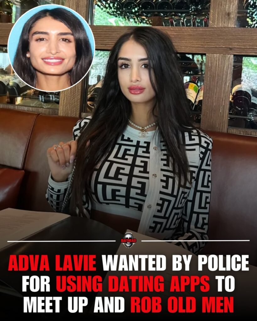 The image presents a striking contrast: a glamorous portrait of a well-dressed young woman seated confidently in an upscale restaurant, paired with bold, alarming text that reads, “ADVA LAVIE WANTED BY POLICE FOR USING DATING APPS TO MEET UP AND ROB OLD MEN.” The combination is designed to shock, provoke curiosity, and spread rapidly across social media feeds.