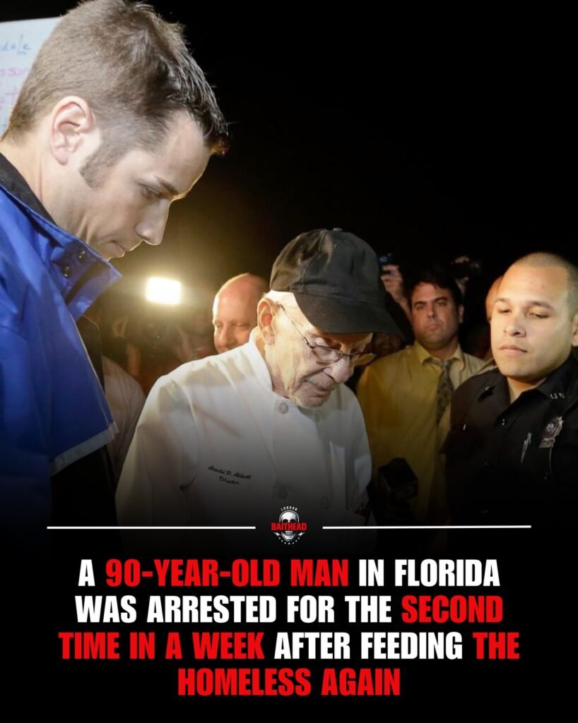The image is stark and unsettling. At its center stands an elderly man—frail, quiet, and visibly worn by time—surrounded by police officers, cameras, and flashing lights. He is not holding a weapon, nor accused of violence. Instead, the caption tells a far more troubling story: a 90-year-old man in Florida arrested for the second time in a single week for feeding the homeless.