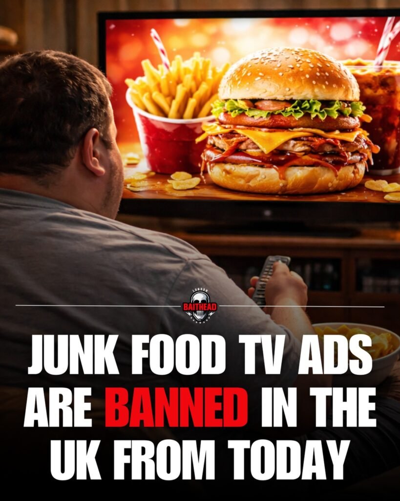 The image shows a familiar modern scene: a man sitting on a couch, remote in hand, eyes fixed on a television glowing with an oversized burger, fries, and soda. The food looks irresistible—glossy, stacked, and perfectly lit. Yet the bold text across the image delivers a stark message: “Junk food TV ads are banned in the UK from today.” Together, the visuals and words capture a turning point in how society views food, health, and the power of advertising.